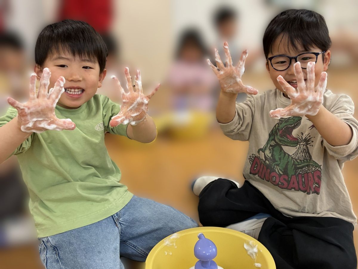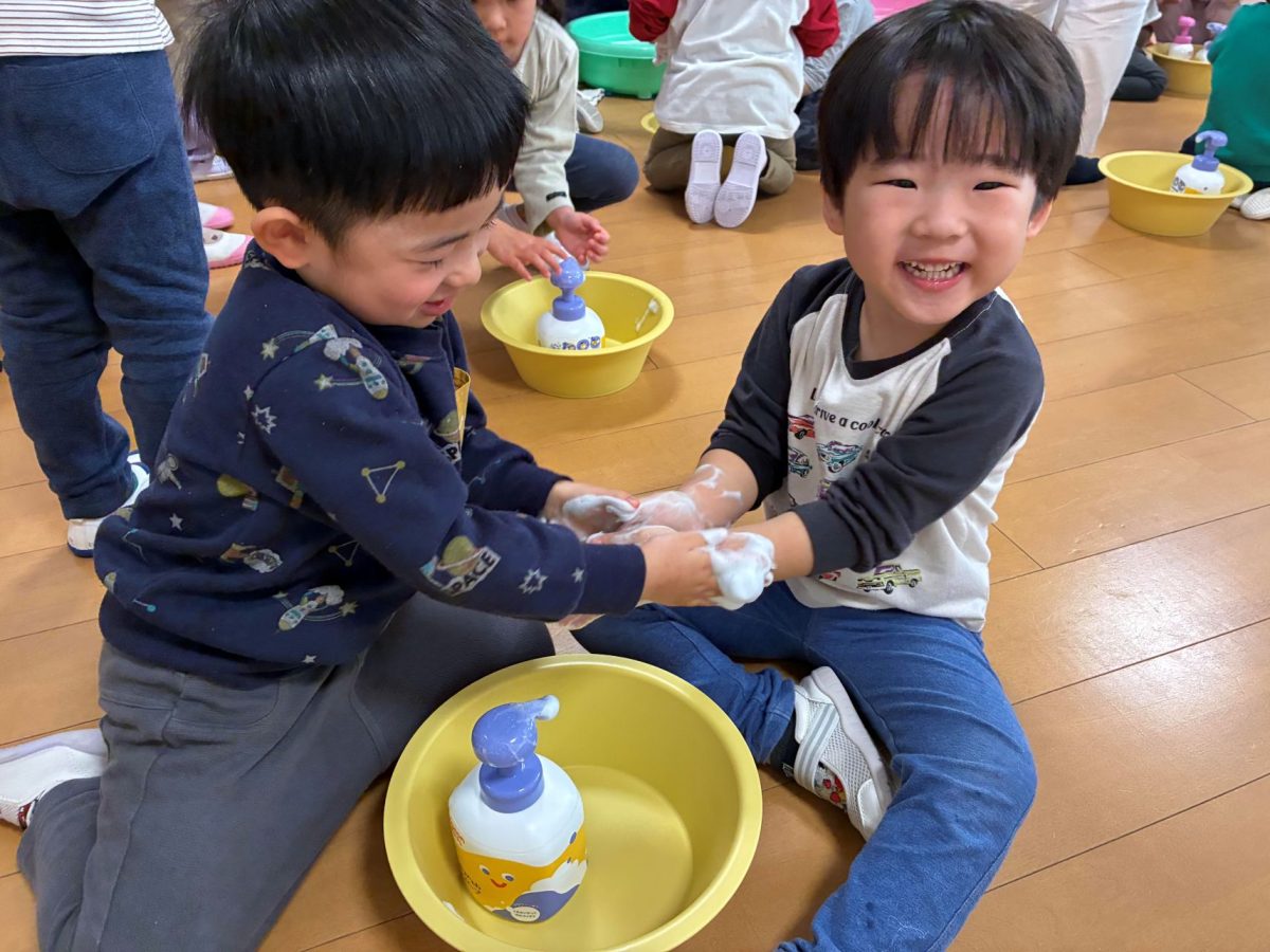 実演の後は、いよいよ園児たちの体験タイムです。みんな「やってみたい!」と前のめりです。2人1組で桶を囲み、泡を手に取ります。はじめは色がついていた泡が、手をゴシゴシとこすり合わせることで白く変わる様子に、皆、夢中になっていました。